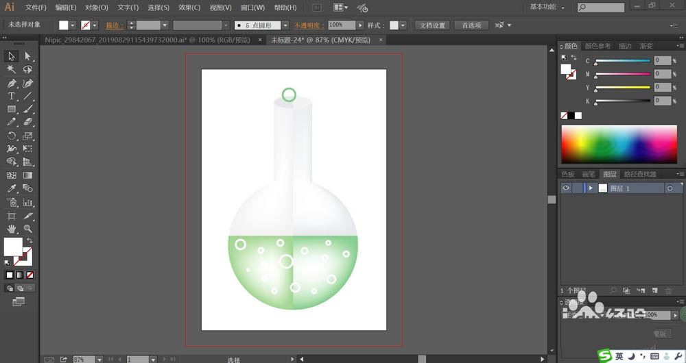 6、用两种明度的灰白色与绿灰色填充烧瓶的瓶身与液体的路径,再分别用两种色彩填充瓶内液体当中的气泡与液体之外的气泡。