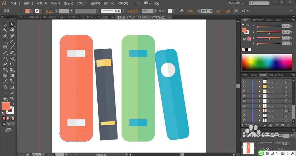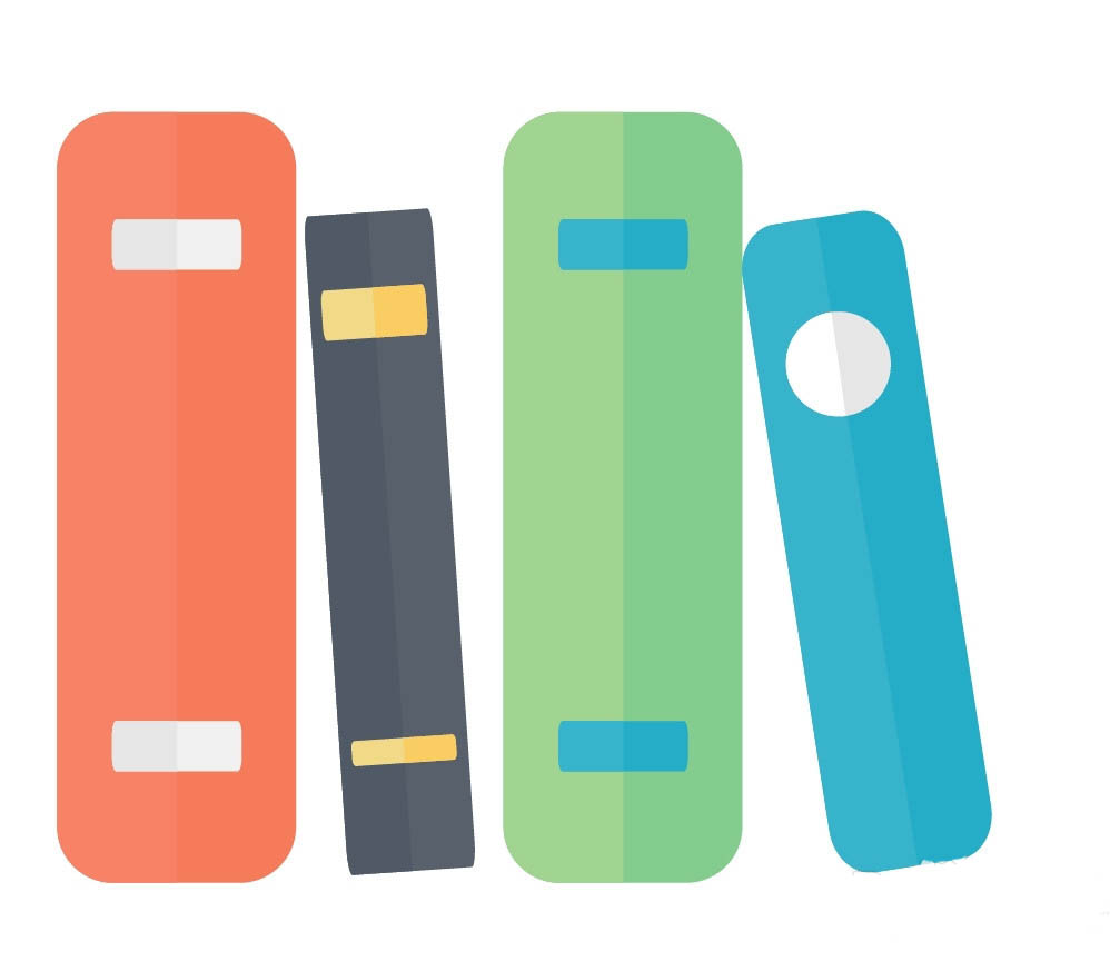 4、继续用红灰色、黑橙色搭配填充左侧的两本书,我们就有了一套完整的书本组合。