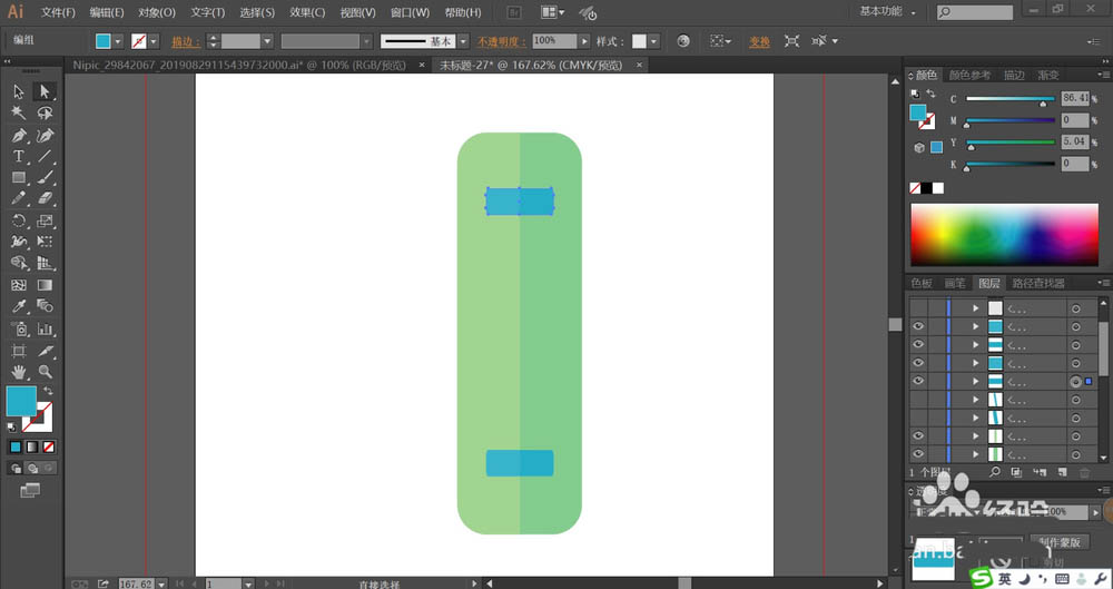 2、设置前景色为绿色,背景色为蓝色,我们用绿色填充书本的正面,用蓝色填充书本上的图案。再分别调整前景色与背景色的亮度,我们用较亮的相似色填充书本的左侧高光区域。