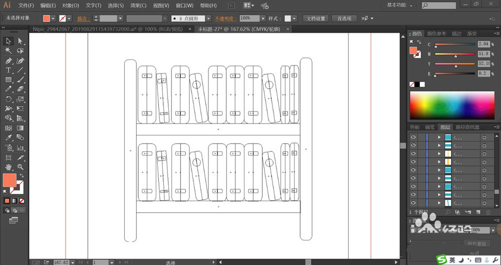 5、接着,我们继续使用圆角矩形工具画出书架的基本轮廓,再把原来画的一套书进行复制,让其均匀的分布到书架上面。