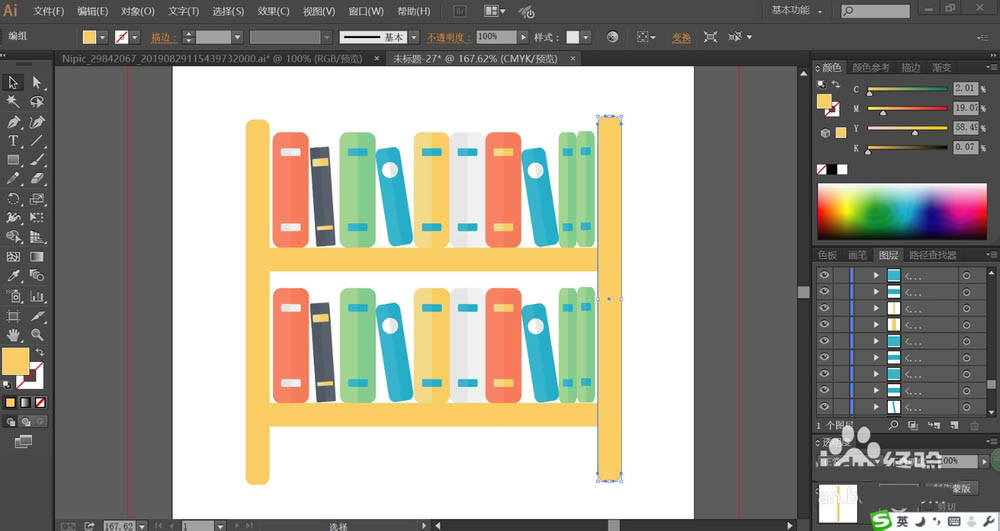 6、这一步,我们在书本当中再做出一个灰蓝色组合填充的书本,让书本的色彩更加的丰富,书架用橙黄色填充。