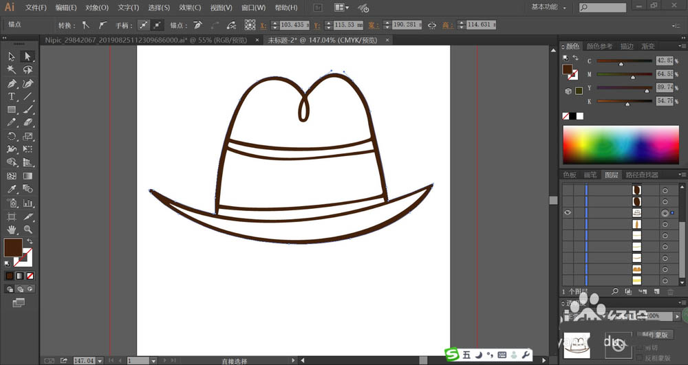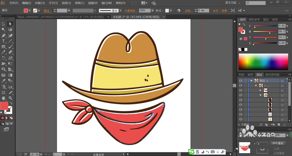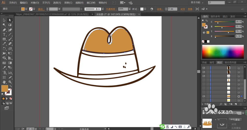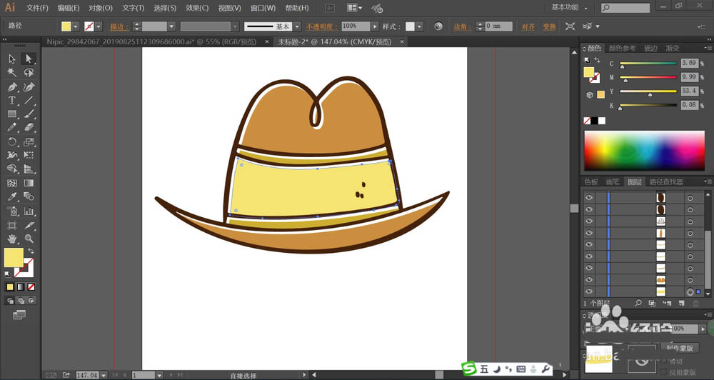 7、最后,我们使用网格工具点击一下帽子的昏黄色与黄绿色区域,分别做出渐变色的效果,对于锚点非常多的人脸路径,我们用粉红色的渐变色直接填充,从而完成牛仔帽图片设计。