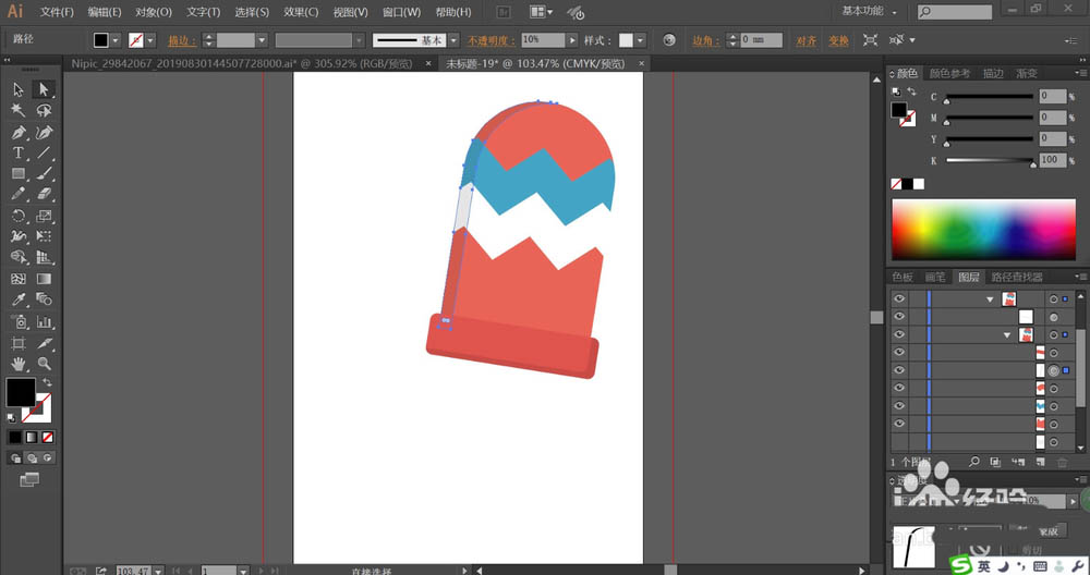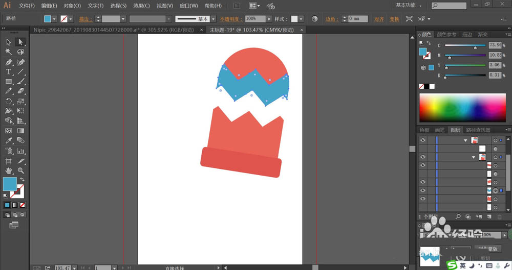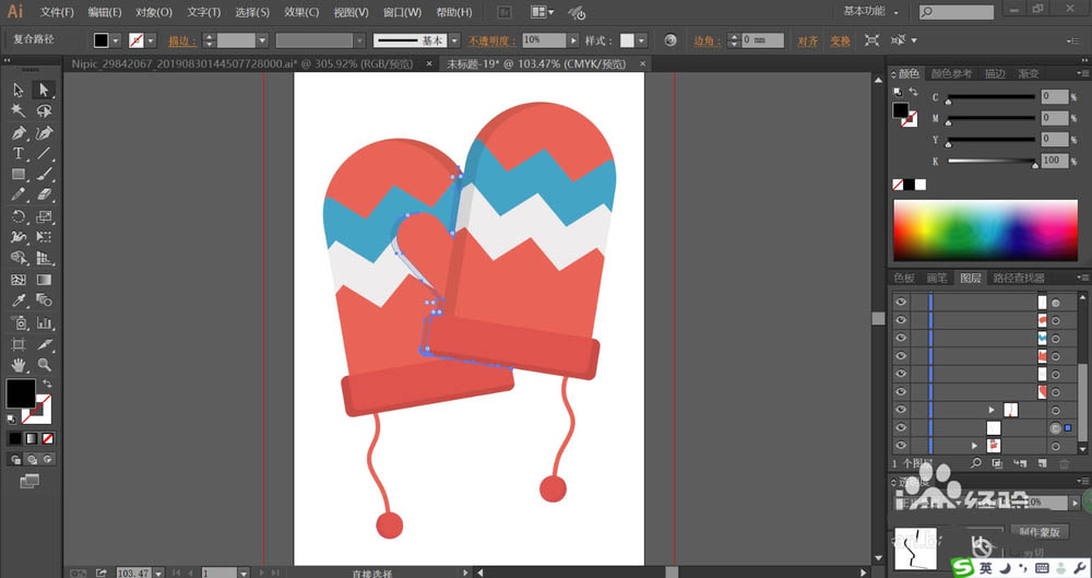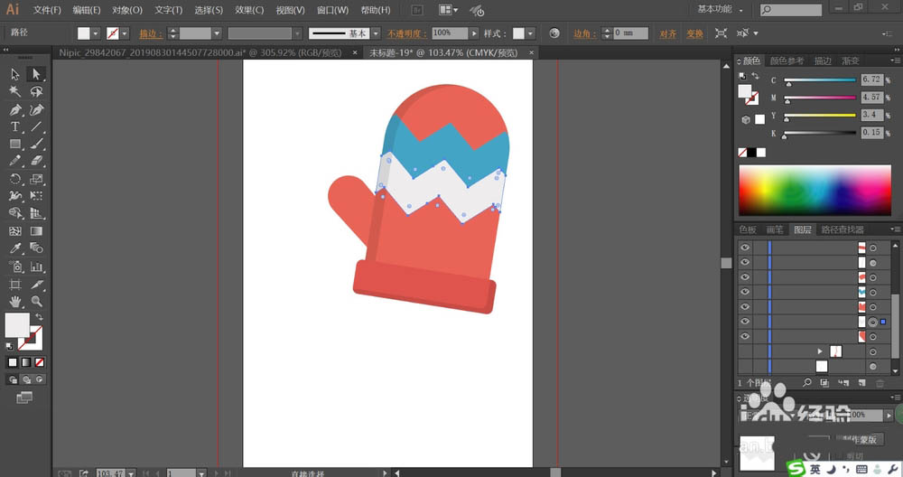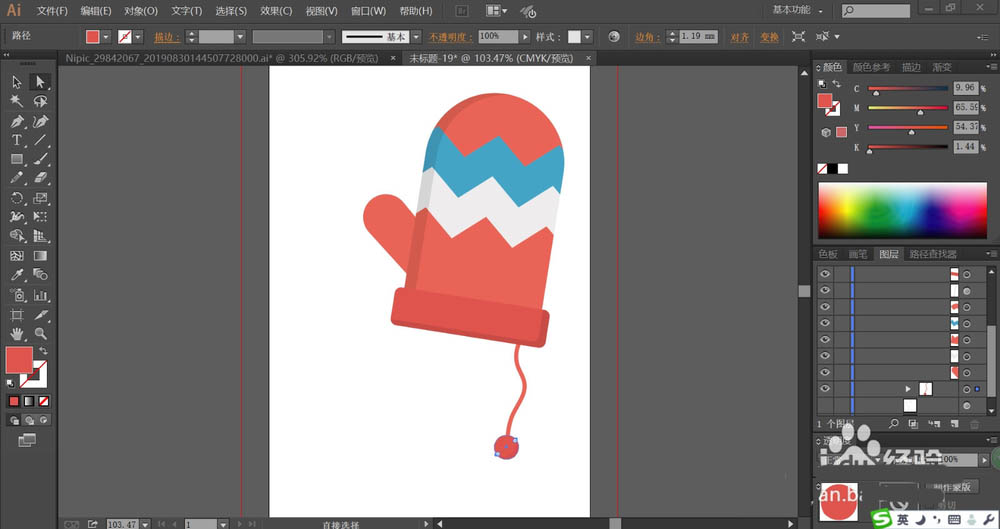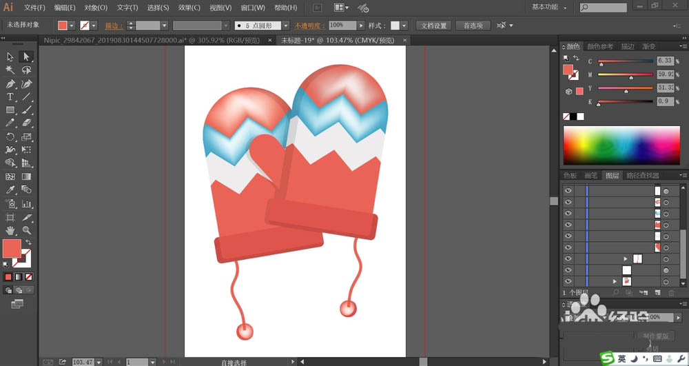7、接着,我们用同样的方法绘制出另外一只手套,紧随后再用网格工具给手套的顶端红色区域与海蓝色区域做出渐变色效果,再给毛线球做出渐变色效果,完成手套图片设计。
