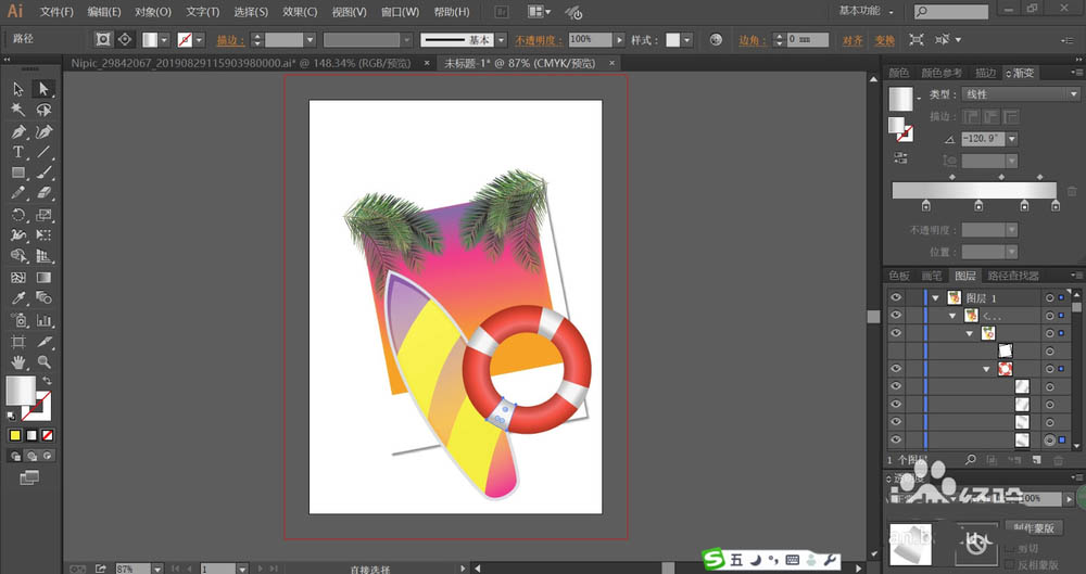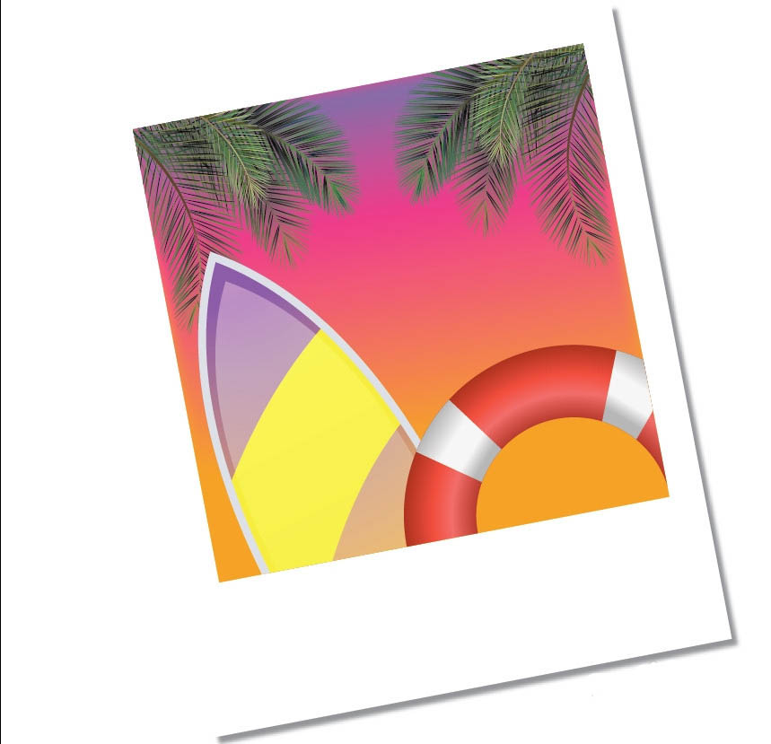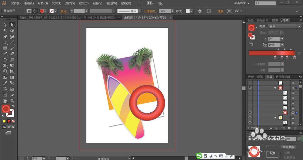 7、最后,我们用圆形工具画出救生圈的形状再用红色的渐变填充,接着,我们用灰白色的渐变填充救生圈上面的图案,让所有的照片元素成为一个组合,再画出一个照片同样大小的路径,用这个路径与照片组合进行剪切蒙版的操作,从而完成风景照片设计。