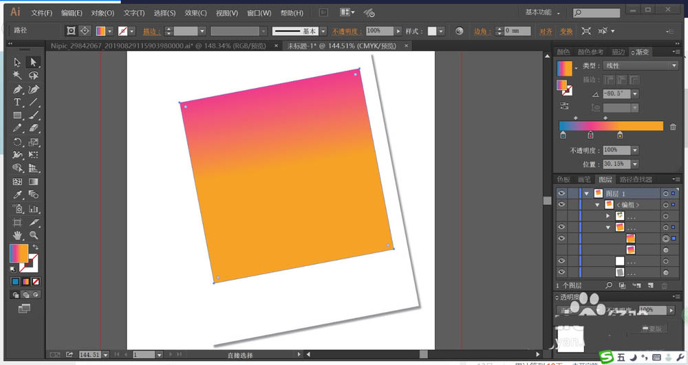 2、设置粉红色、橙黄色的渐变,我们用渐变色填充照片所在的背景路径。