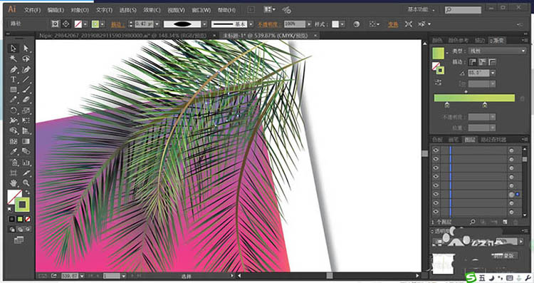3、在照片的上方画出树枝与树叶,用绿色的渐变填充树叶,用黄绿色的渐变填充树枝。