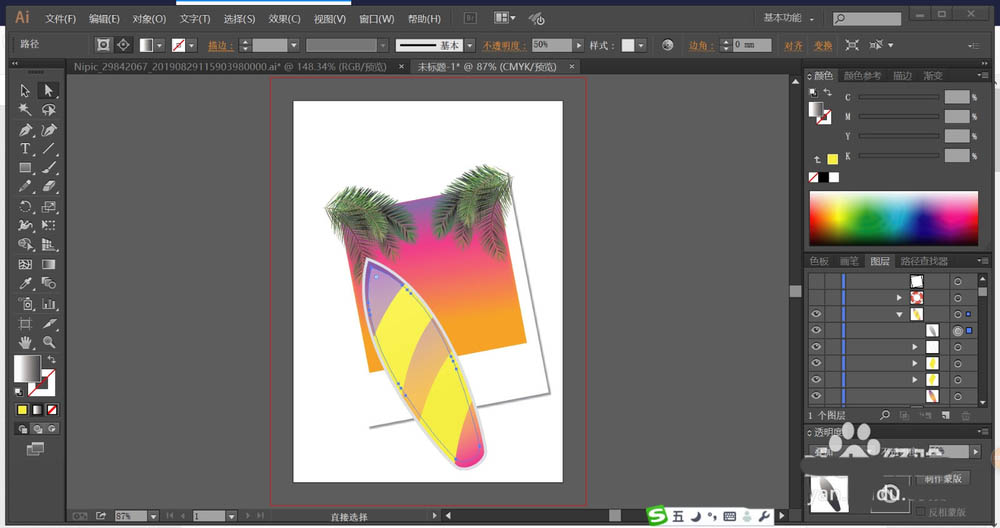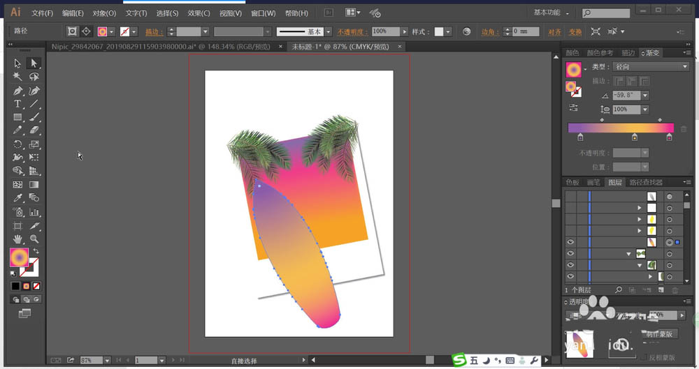 5、使用钢笔工具画出照片下方的冲浪板的路径,我们用紫红色、橙黄色、粉红色的渐变效果冲浪板的路径。
