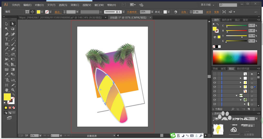 6、用黄色填充冲浪板上的图案,再用灰白色填充冲浪板的边缘,最后,再用叠加模式的渐变色填充冲浪板的内部,完成冲浪板的绘制。