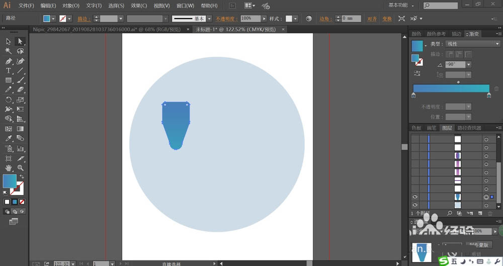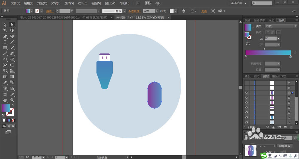 2、用蓝色的渐变填充插头,再用天蓝色填充圆形背景,让深色与浅色的相似色搭配起来。