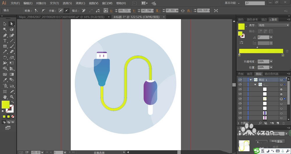 7、最后,我们也可以用黄色的渐变填充两个插头之间的连接线,让数据线呈现另外一种色彩搭配风格,完成数据线图标设计。