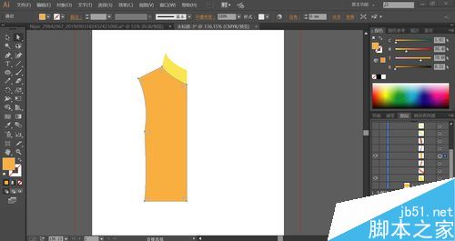 接着,我们用黄色填充左侧袖子上面的条纹,再用橙红色填充衣服上面的口袋路径。