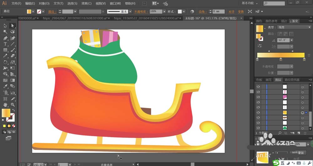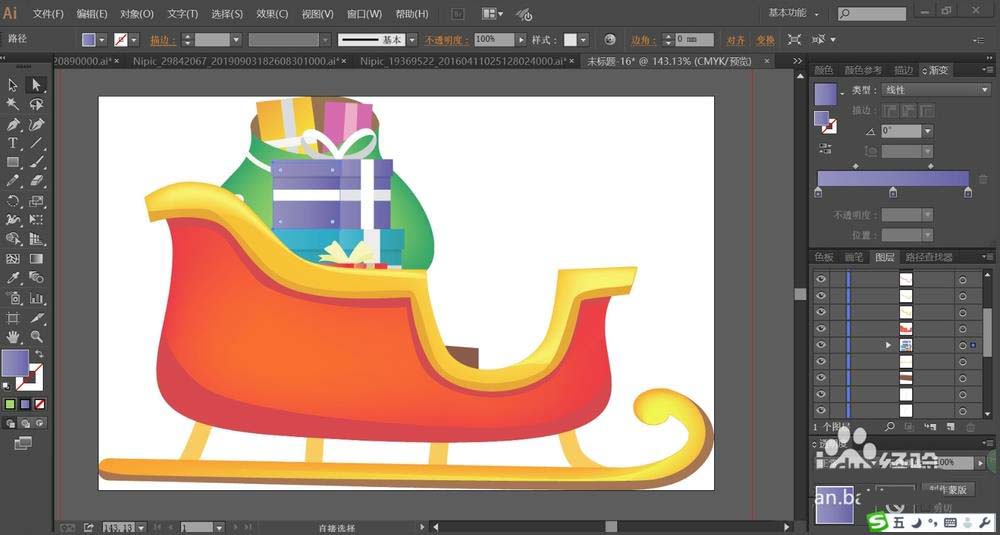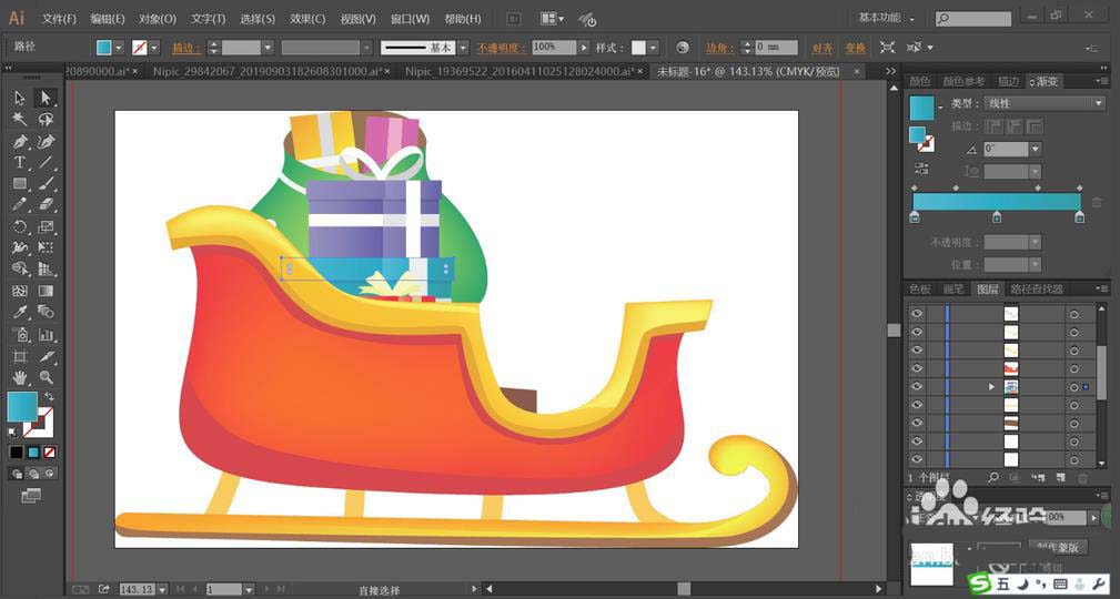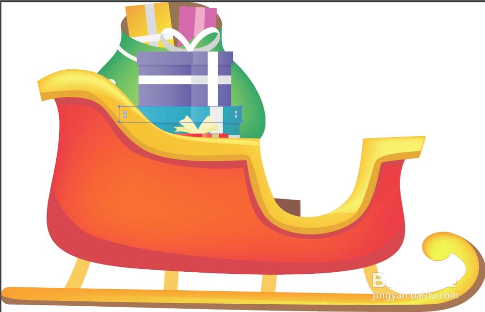 8、最后,我们用网格工具点击绿口袋做出绿色渐变的效果,再用蓝紫色的渐变与蓝色的渐变分别填充两个礼盒,完成礼物雪橇图片设计。
