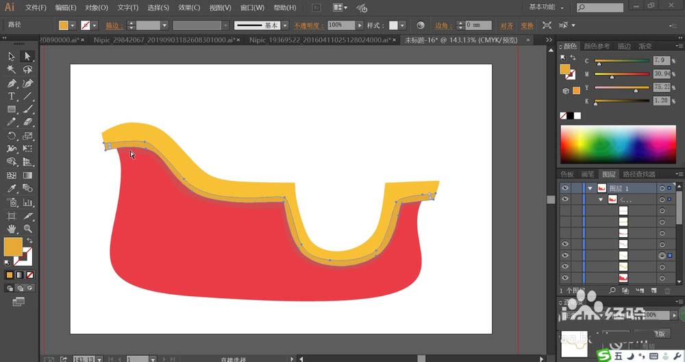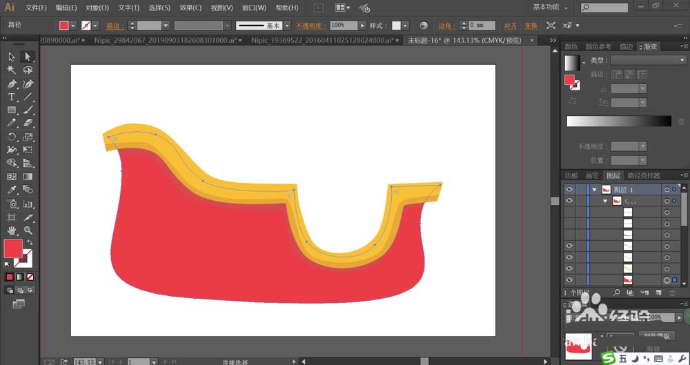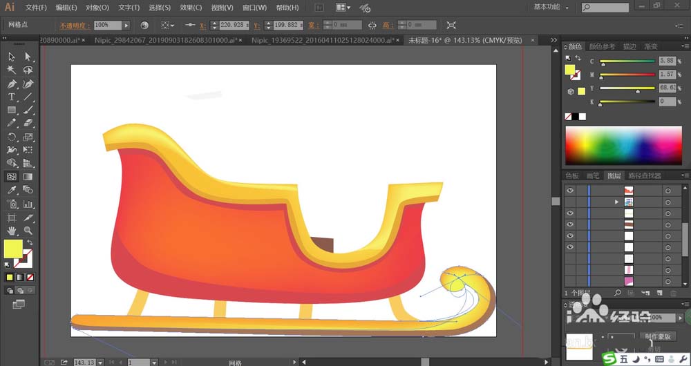 4、使用网格工具为雪橇的红色区域做出红色渐变效果,为雪橇的橙色区域做出橙色渐变的效果。