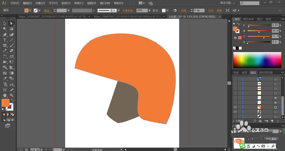 6、设置前景色为橙黄色,背景色为橙色,我们用橙黄色与橙色搭配填充面罩前面的边缘形状,使用棕色填充面罩后面的结构件,再用正片叠底的棕色填充结构件下方的暗光区域。