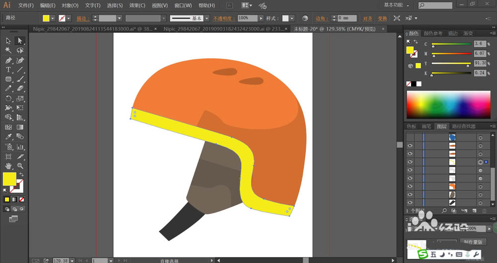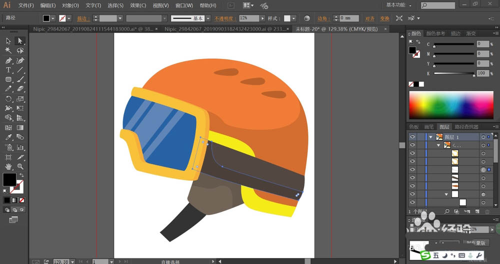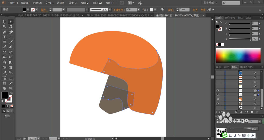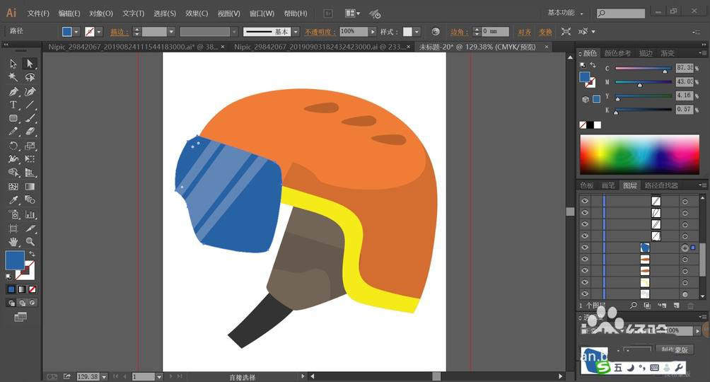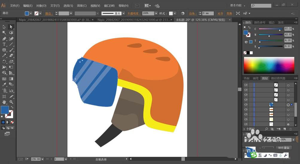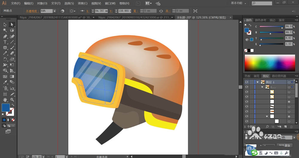 7、最后,我们使用透明度为60%左右的桔黄色填充头盔的半圆形状,再用透明度为60%的蓝色填充面罩的玻璃区域,分别用网格工具做出渐变效果,让其呈现一个光线变化的效果,完成头盔图片设计。