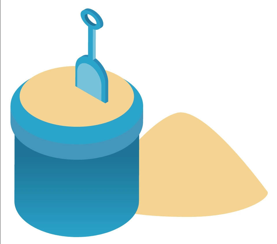 6、接着,我们再土黄色填充沙桶入口处的沙子的路径,铲子正面的内部用淡蓝色填充,铲子下方的两侧用暗蓝色填充。