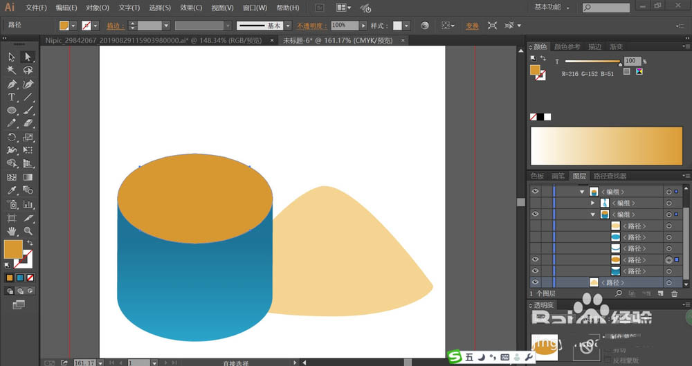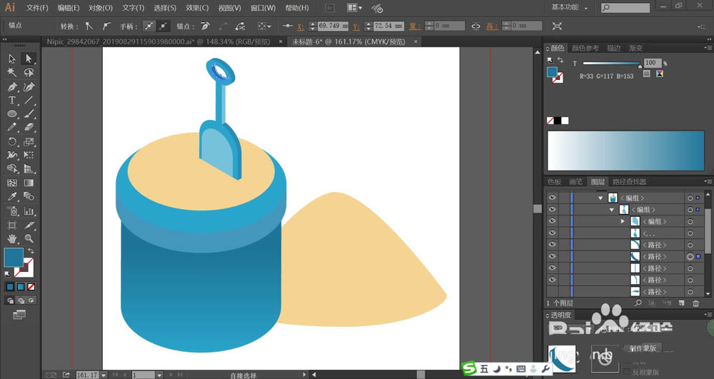 2、接着,我们用钢笔画出沙桶的正面路径再填充蓝色的渐变。