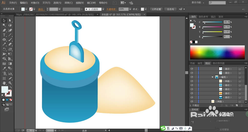 7、使用网格工具,我们点击沙子与铲子,分别制作出土黄色的渐变效果与蓝白色的渐变效果,完成沙桶图片设计。