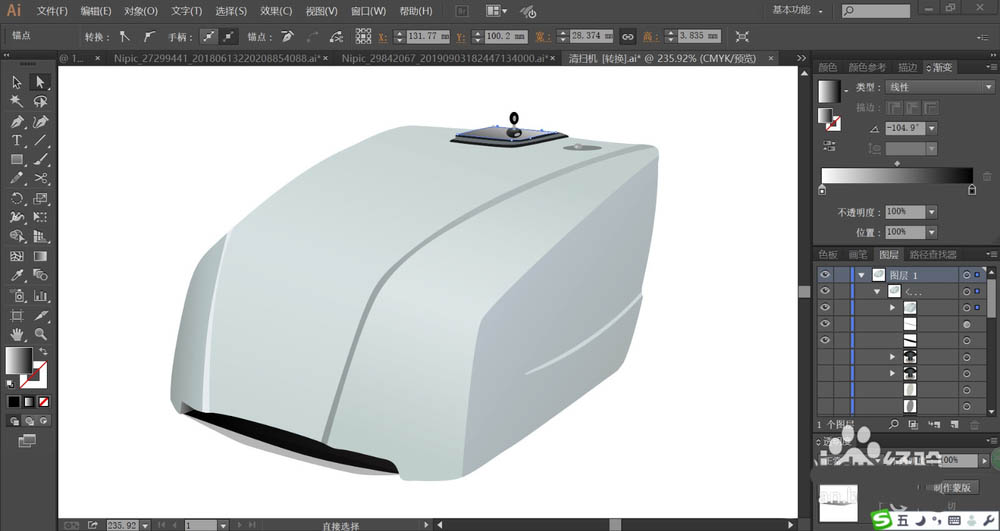2、我们用灰白色的渐变填充扫地机的正面路径,再用灰色的渐变填充扫地机的右侧面的路径,上方的按钮区域用灰黑色的渐变填充,下方的按钮区域也用灰黑色与灰色结合填充。