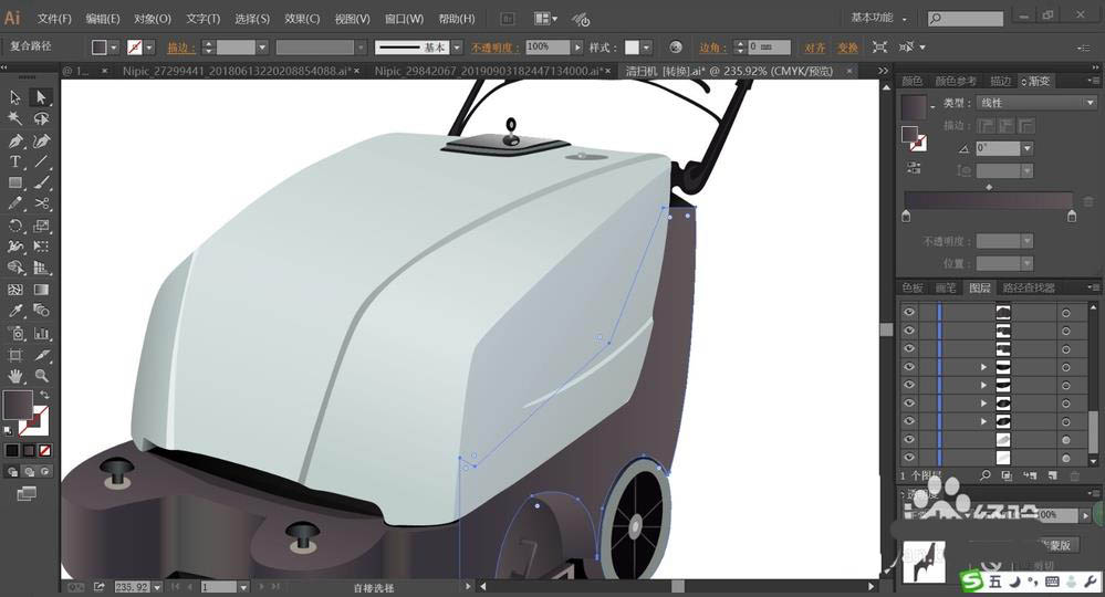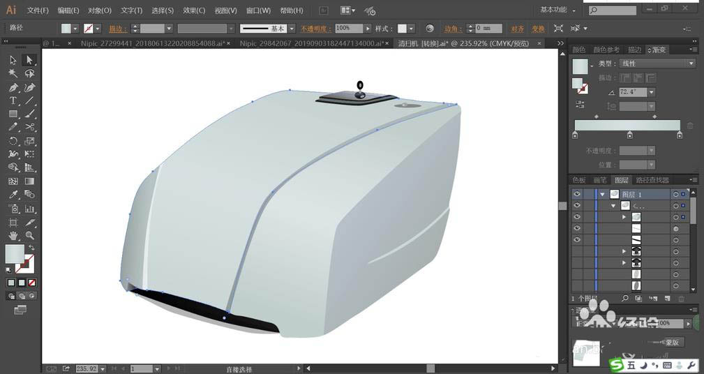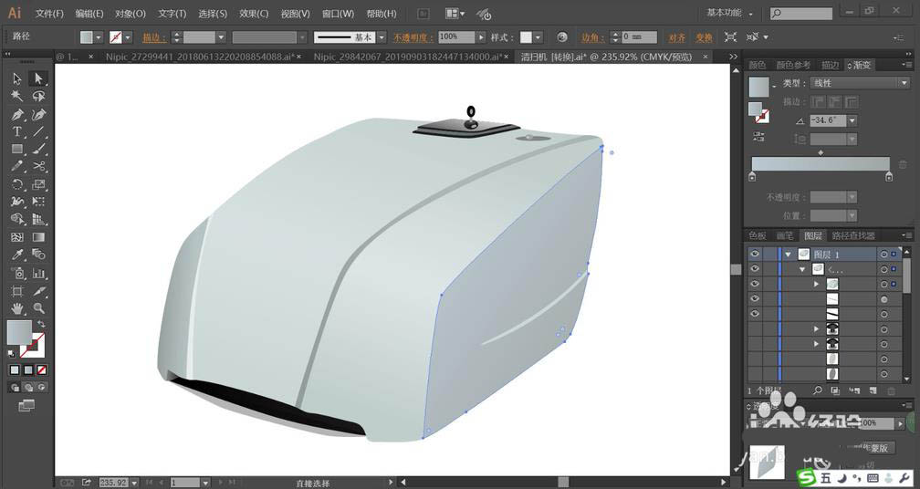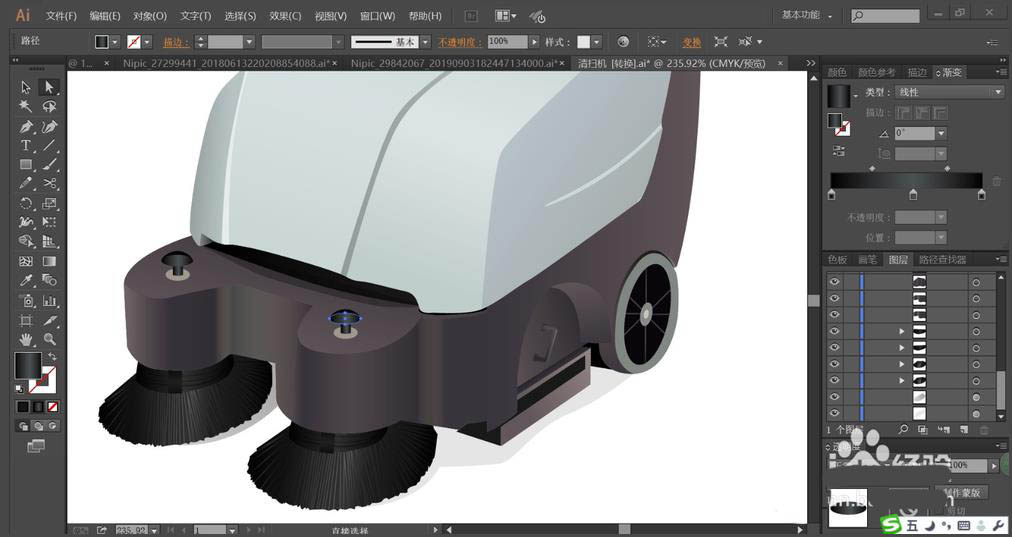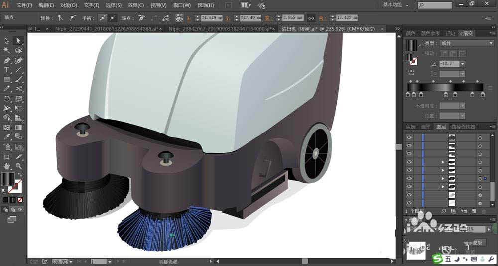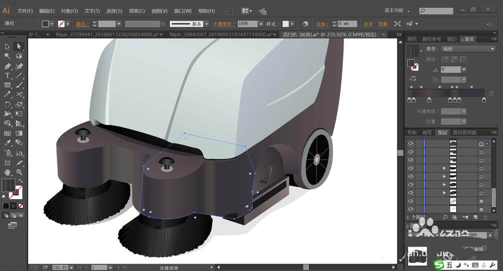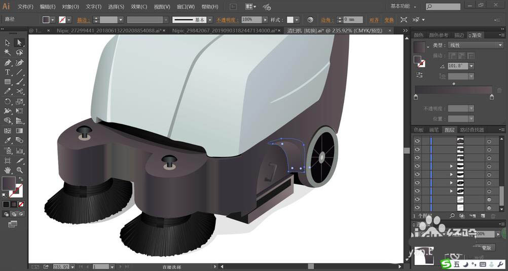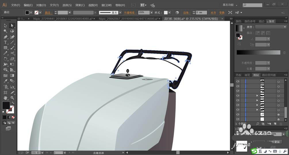 4、这一步,我们画出扫地机上方的手柄路径并用灰黑色填充,再画出扫地机右侧下方的结构件再用灰黑色的渐变填充。