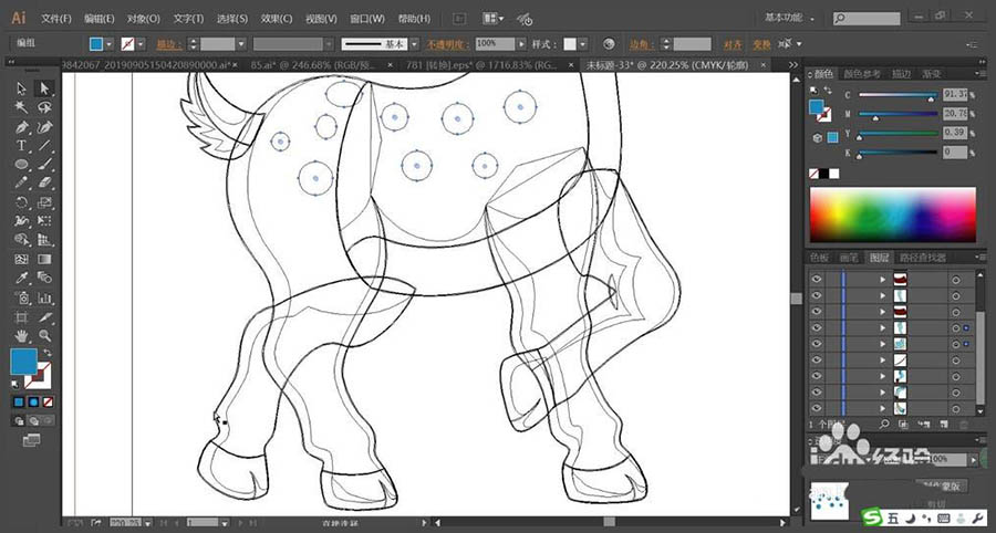7、小鹿的腿底部用三种红棕色分别填充不同光线区域,再使用网格工具点击一下小鹿身体的高光区域,我们做出天蓝色的渐变效果,点击小鹿的蹄子高光区域做出红棕色的渐变效果,完成小鹿图片设计。