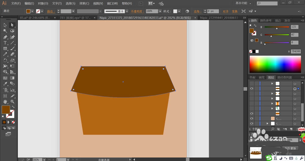 5、继续使用橙色与暗棕色搭配填充屋顶的烟筒,在暗光区域用正片叠底模式的橙色填充在右侧,屋顶再用灰白色与灰色搭配填充曲线波浪路径。