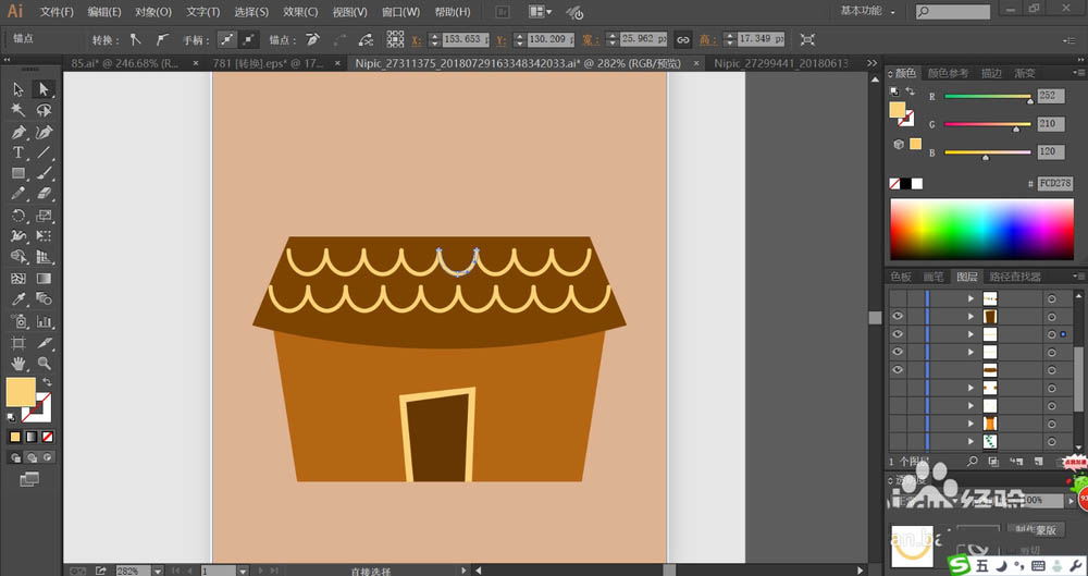 3、接着,我们用黄色与暗棕色搭配填充屋顶的曲线路径,再填充墙壁中间的小门,让小门的边缘为黄色。
