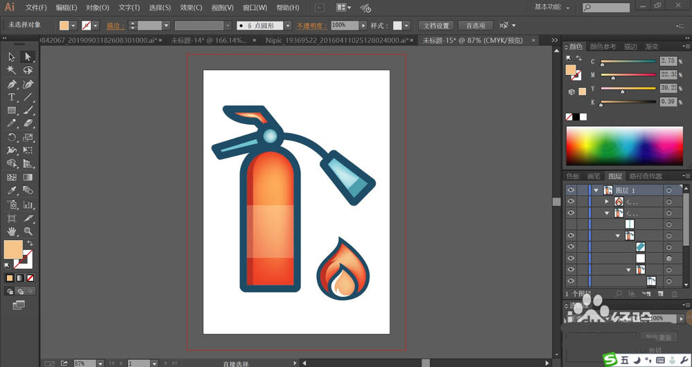 7、最后,我们使用钢笔画出火苗的路径,再用红色、蓝黑色、粉红色、白色分别填充火苗的各个区域,再使用网格工具点击一下红色让其呈现红色的渐变效果,完成灭火器图片设计