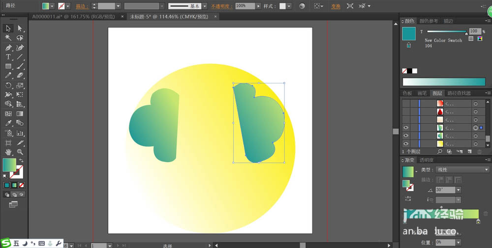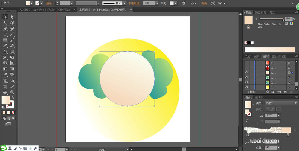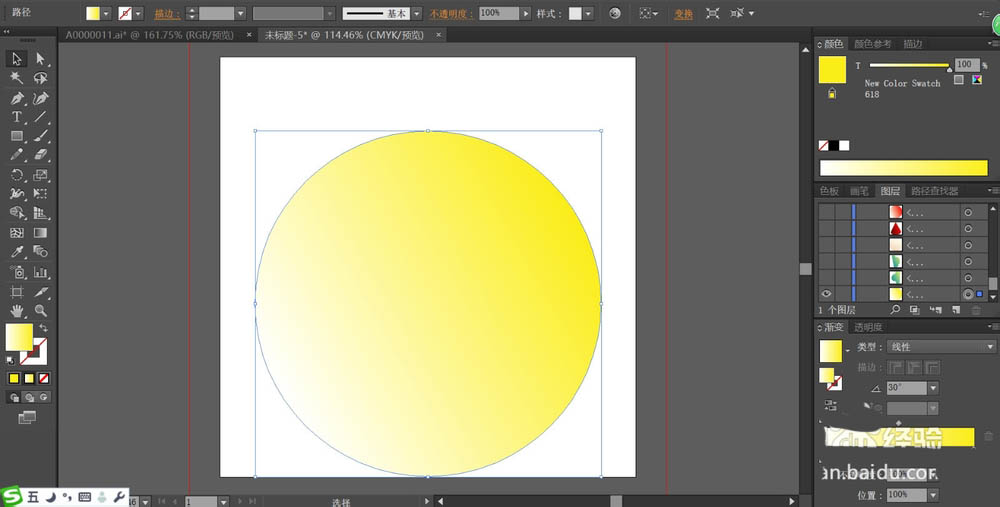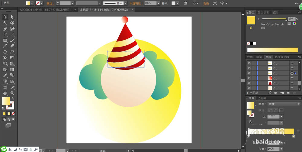 1、先用圆形画出一个小丑的身体路径,我们用白色到黄色的渐变填充这个圆形。
