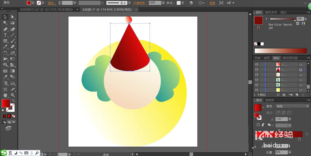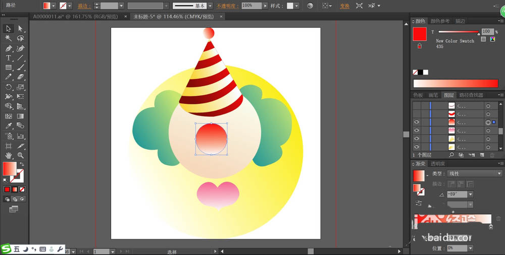 4、这一步用圆形与钢笔画出小丑的帽子,我们用红色的渐变填充这个帽子,再用圆形画出上面的小球。我们用红白色的渐变填充这个小球。