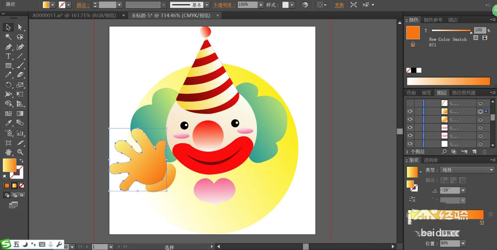 8、使用钢笔画出小丑的两个小手,我们用橙色的渐变填充手部路径,再用钢笔勾勒出手部的暗光区域并用暗红色填充,完成小丑形象设计。