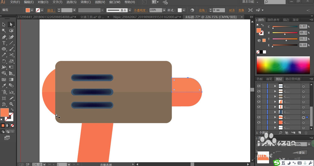 5、接着,我们使用橙红色填充电钻的前后与下方手柄的结构件,最下方依然用两种不同明度的棕色填充。