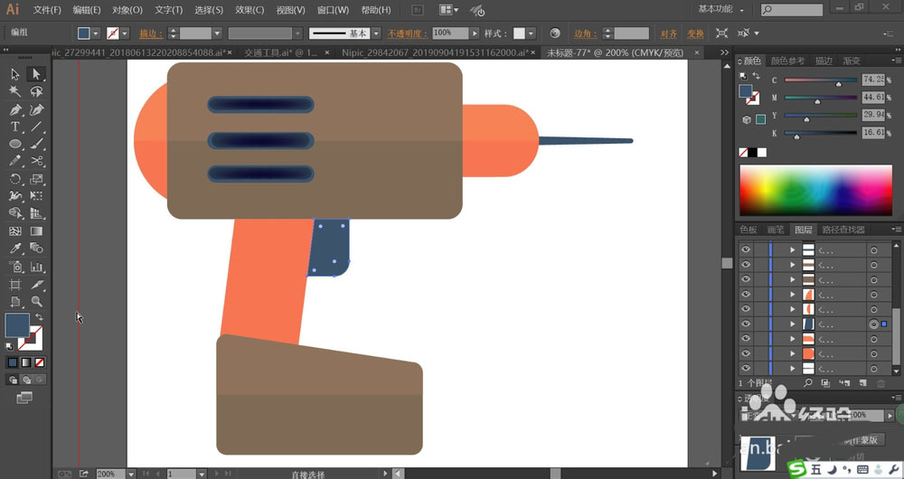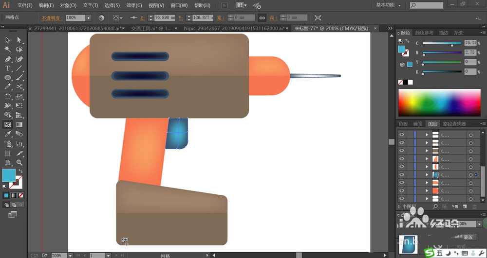 7、最后,我们使用网格工具点击电钻的橙红色结构件让其呈现橙红色的渐变效果,再使用网格工具点击开关与钻头,让其呈现蓝色渐变效果,完成电钻产品设计。