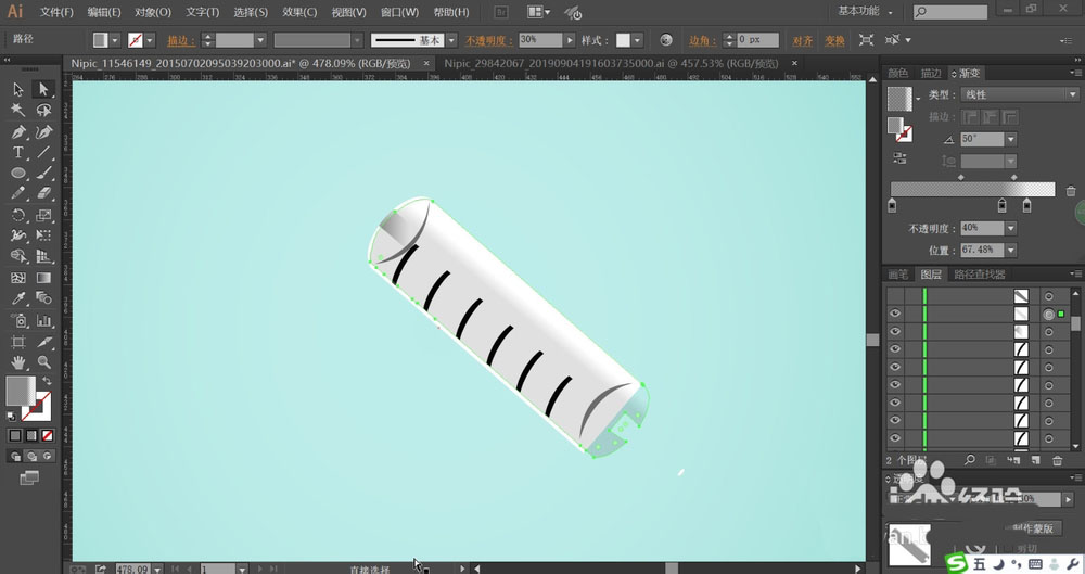 3、接着,我们设置透明度为40%的灰黑色渐变填充玻璃管的左侧壁,从而让暗光效果呈现在玻璃管的上面。