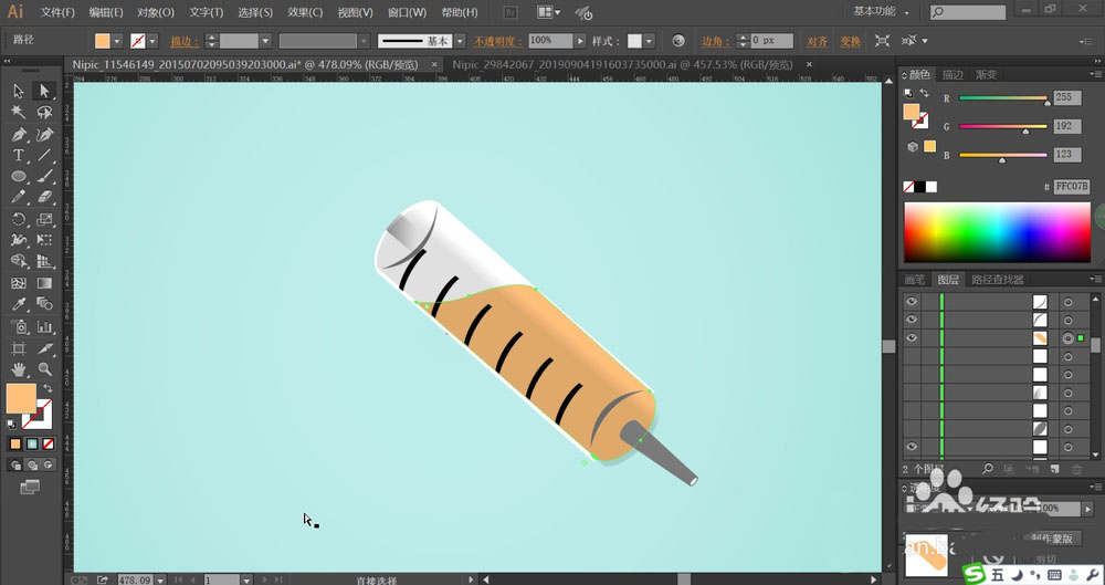 4、这一步,我们用沙黄色填充玻璃管内的液体所在的路径,再用灰黑色填充针管的下方的注射头。
