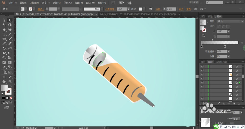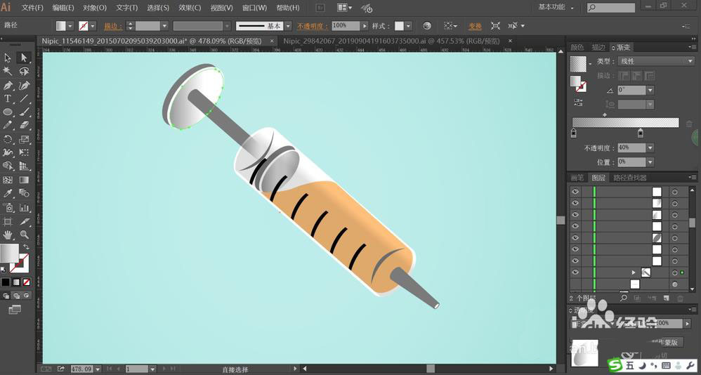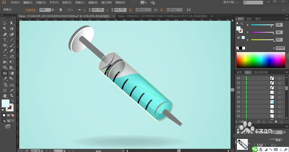 7、最后,我们也可以把针管内的液体用天蓝色填充再用网格工具做出渐变色的效果,完成针管图片设计。