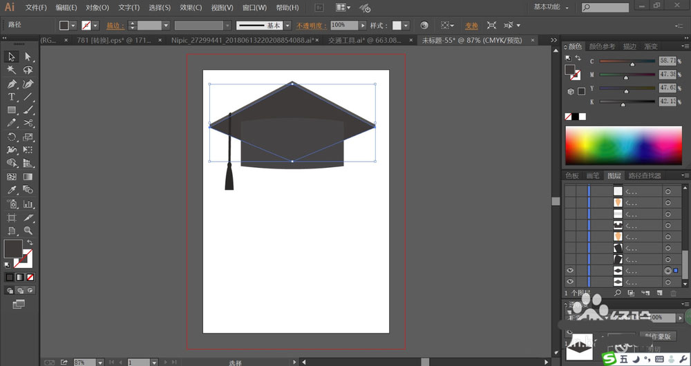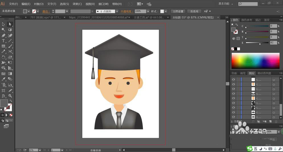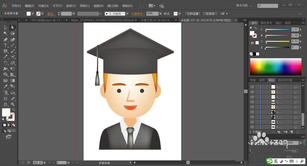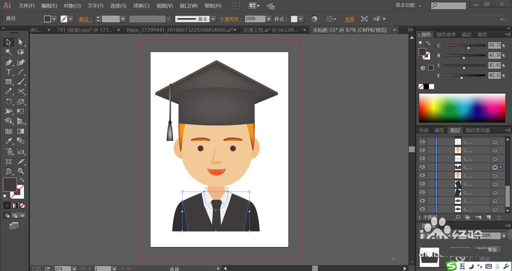 1、使用钢笔绘制出人物的基本轮廓,重点元素:博士帽、表情、西服与领带、衬衫等等元素的路径。