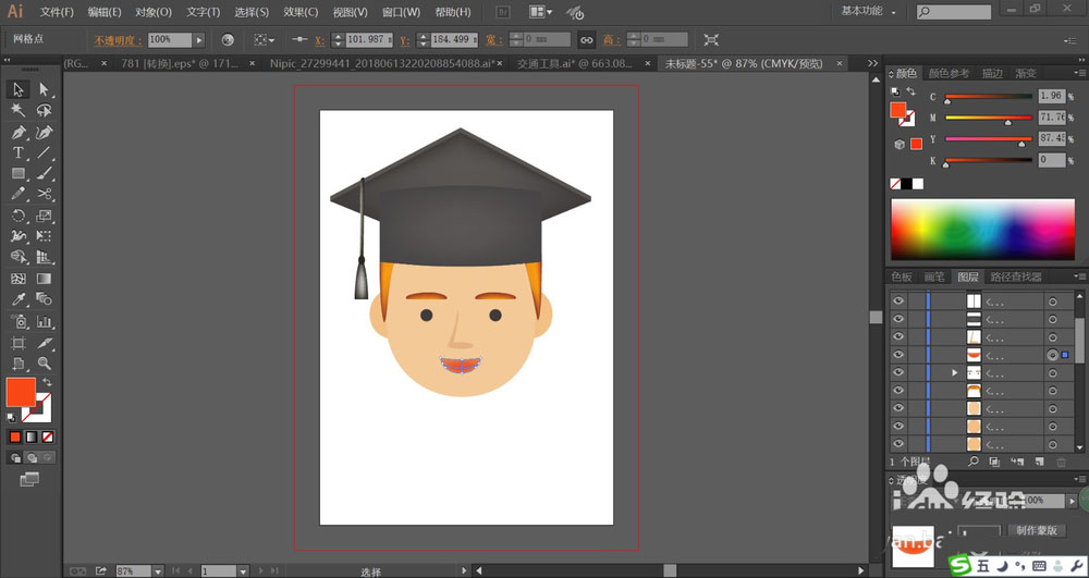 7、使用网格工具点击西服让中间呈现高亮效果,点击领带让其立体化凸出,点击一下人脸让其呈现粉色渐变,呈现打光效果,完成博士头像设计。