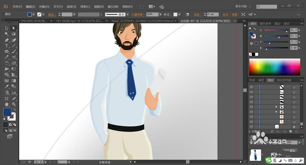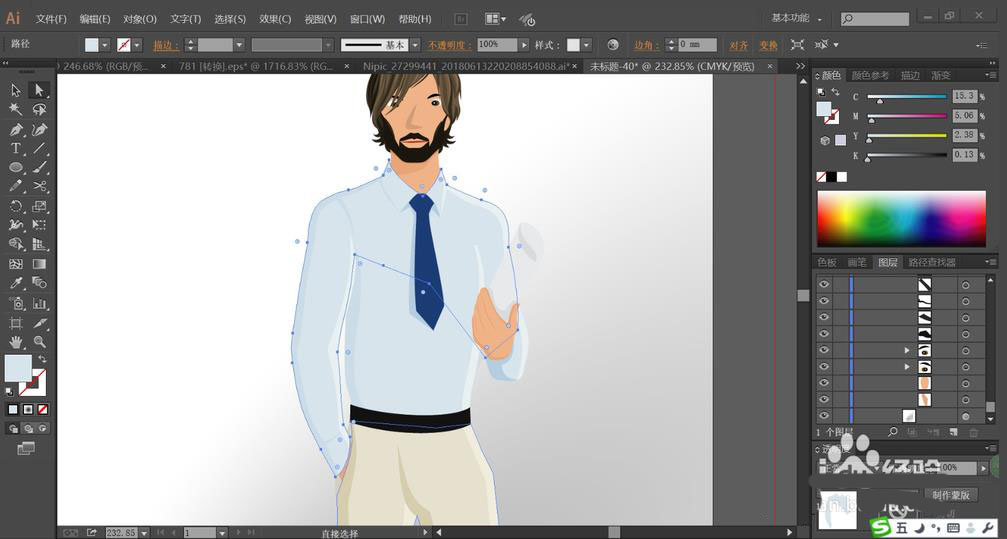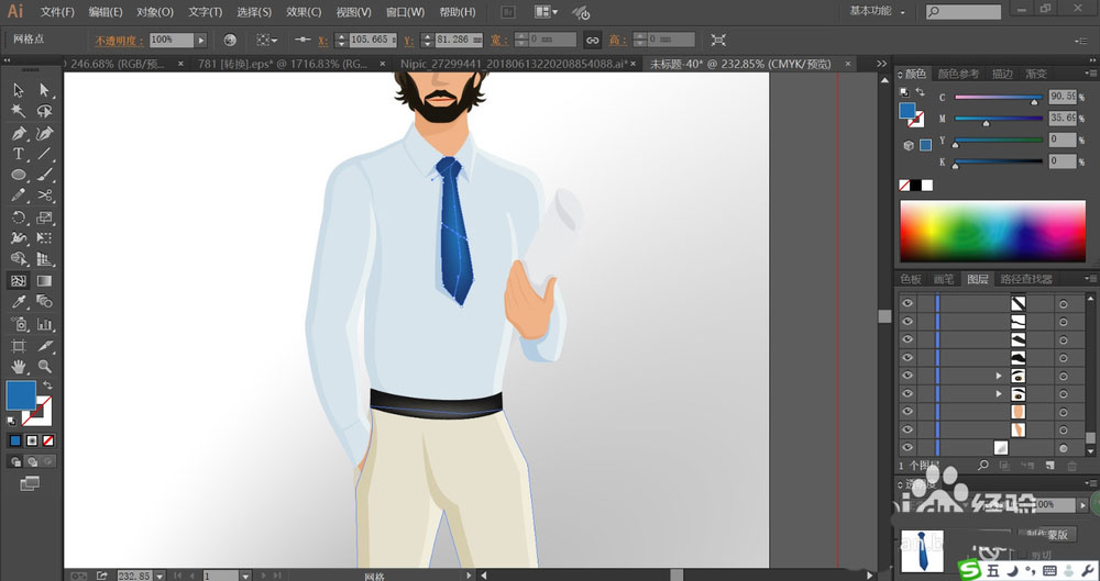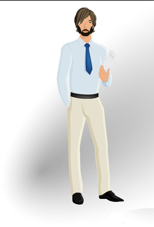 7、最后,我们用网格工具分别点击领带与皮带并做出蓝色渐变与灰黑色渐变的效果,画面背景我们用浅灰色的渐变填充,完成男设计师形象设计。