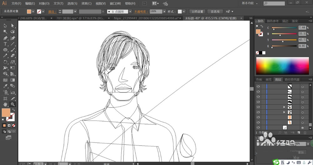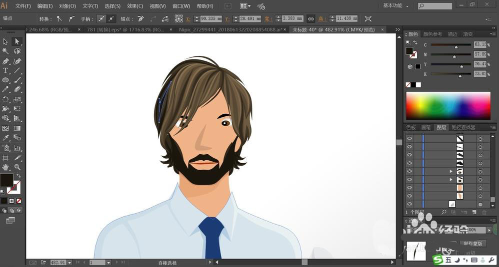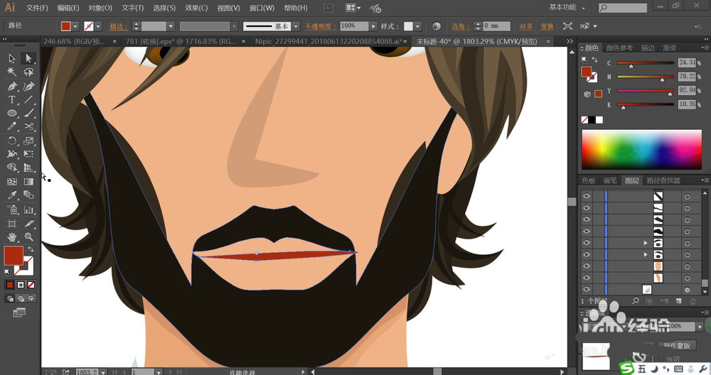 1、使用钢笔画出人脸的基本轮廓,再画出头发的细节路径,描绘出眼晴与嘴巴,脸部的胡子也用路径一一呈现出来。