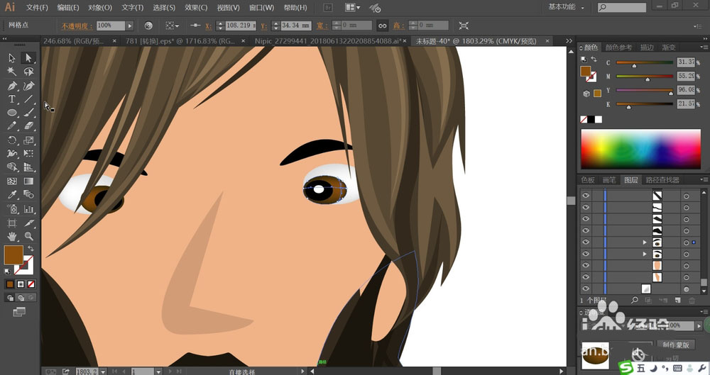 3、男人的脸部用粉色填充,眼晴使用网格工具做出灰白色的渐变在眼白路径上,做出棕色的渐变在瞳孔的外围,再搭配灰黑色与灰白色进行瞳孔的主体与高光区域的填色。