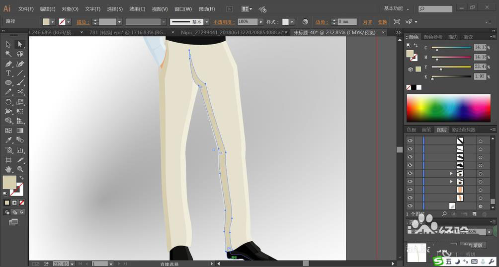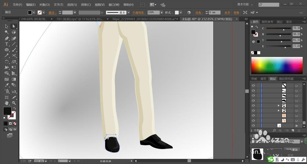 6、男人的长裤用明暗两种米白色进行填充,男人的皮鞋用灰黑色与黑色搭配填充不同的元素结构。