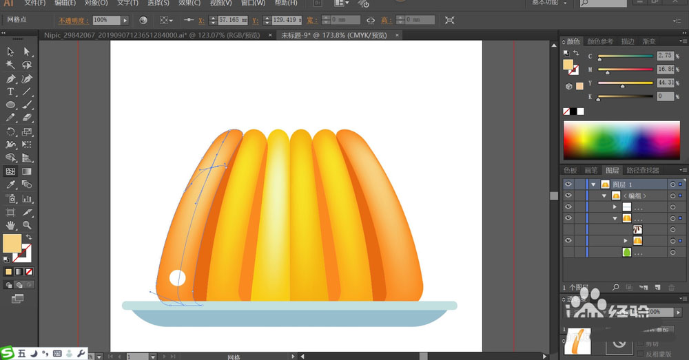 4、接着,我们用网格工具分别点击一下糕点的上面位置,让其呈现橙色渐变、橙黄色渐变、橙红色渐变。
