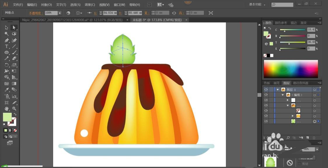 7、最后,我们用绿色填充糕点上方的蔬菜叶子,再用网格工具制作绿色渐变效果,完成糕点图片设计。