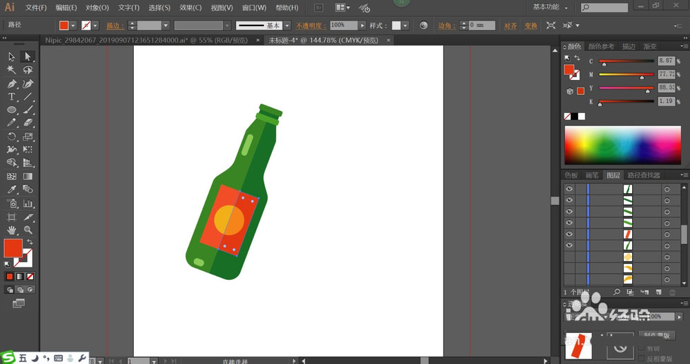 4、使用网格工具点击瓶身左侧,让其呈现绿色渐变,网格工具点击标贴,让其呈现红色渐变,点击标贴左侧圆形图案,让其呈现橙色渐变效果。