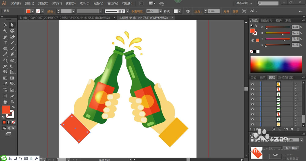 7、最后,我们用网格工具点击一下袖口,让左手呈现橙红色的渐变,让右手呈现橙黄色渐变,完成干杯图片设计。