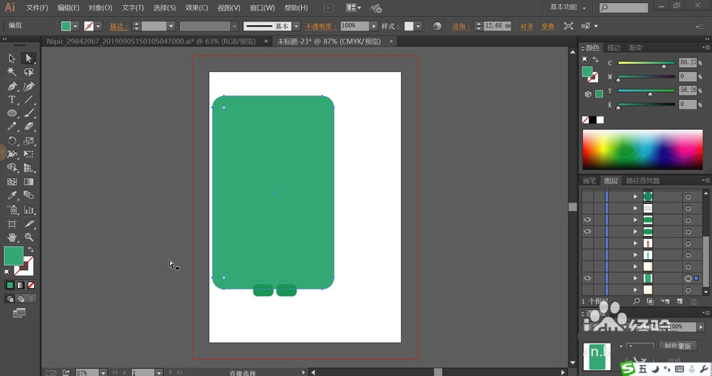 2、使用浅绿色与绿色搭配填充万用表的主体与下方的两个支撑脚的路径。