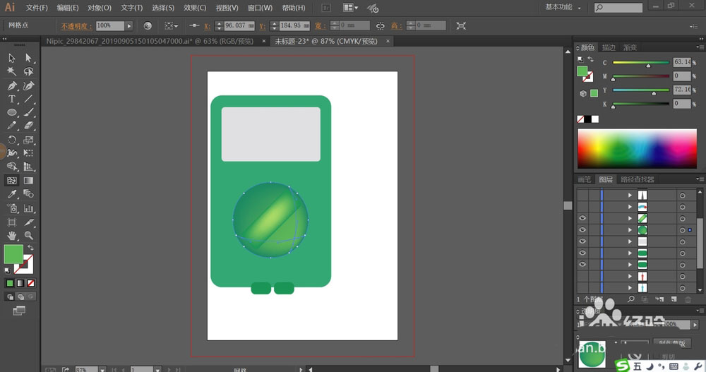 4、使用网格工具分别点击按钮的不同结构件,让其呈现不同的绿色渐变,再用灰色填充屏幕所在的区域。