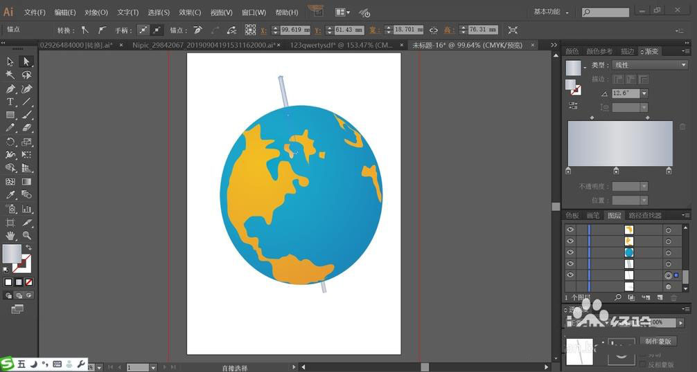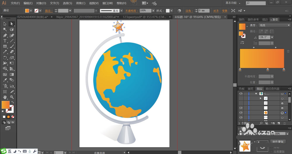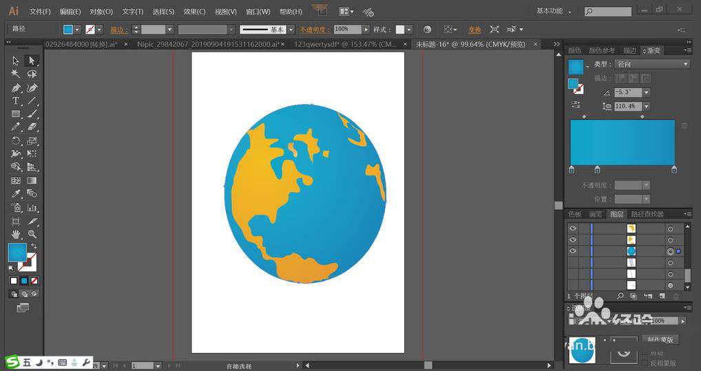 2、使用蓝色的渐变与橙色的渐变搭配分别填充地球本身与左右两侧的陆地。