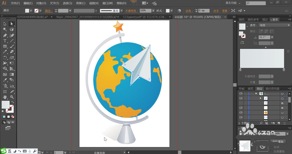 7、最后,我们用灰白色的渐变填充飞机,再用半透明的蓝灰色填充飞机中间的暗光路径,接着,我们用透明度为16%的黑色填充飞机在地球仪上面的阴影,完成地球仪图片设计。
